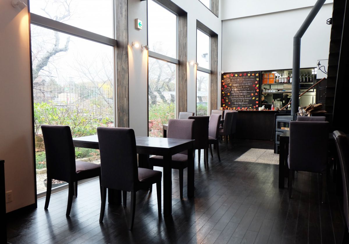店内は一面ガラス張りの開放感ある雰囲気が魅力的。四季の移ろいを眺めながら、ゆったりと食事を楽しむことができます。また、本格的な薪ストーブもあって、ポカポカと暖かい空間が広がります。