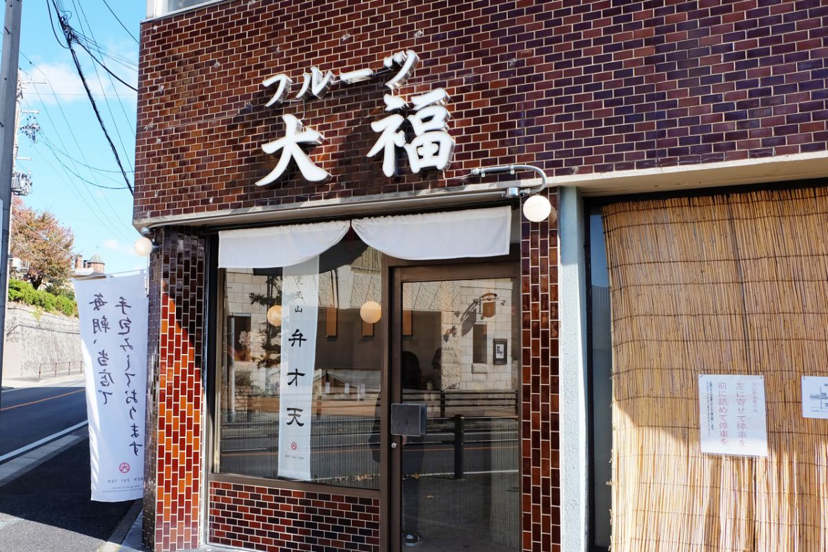 “フルーツ大福”の文字が印象的な「覚王山弁才天」は、閑静な住宅街の一角にひっそりとたたずむお店。昔ながらの和菓子屋さんのようなたたずまいが印象的です。