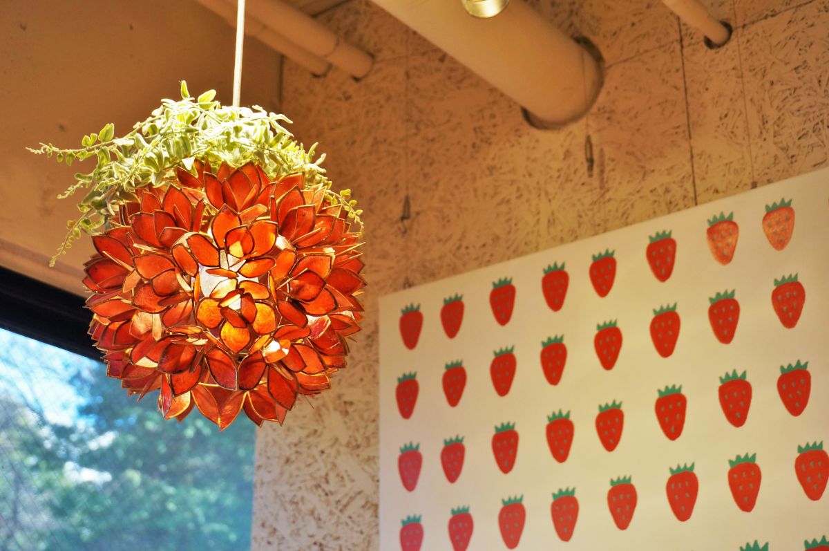 “いちごのテーマパーク”を意識したカフェで、店内は赤と白を基調とした色合いで統一されています。もちろんランプもかわいい“いちご形”。