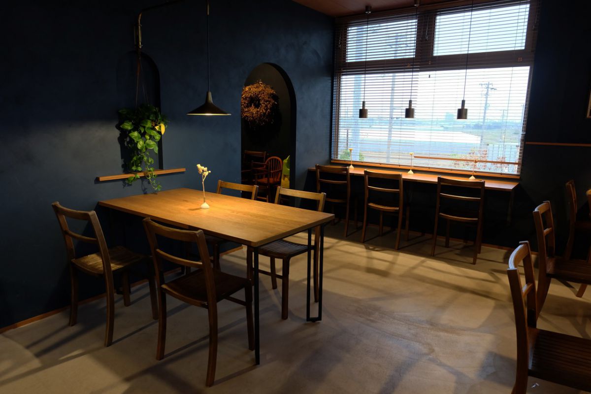 店内に足を運ぶと、洗練されたスタイリッシュなインテリアが目を引きます。さりげなくテーブルを照らす小さな照明と、木のテーブルと椅子。そして、藍色の壁が印象的です。昼と夜で、店内の雰囲気が変化する様も魅力的なんだそう。