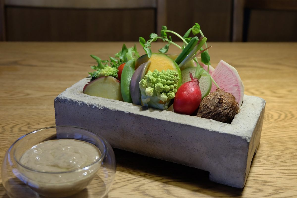 ここへきたらオーダーして欲しいのが、オーナーシェフ一押しの「バーニャカウダー」(1200円+税)です。地元産の野菜のほか、食用の多肉植物“グラパラリーフ”やカリフラワーにも似ている“ロマネスコ”など、珍しい個性的な野菜も楽しむことができます。