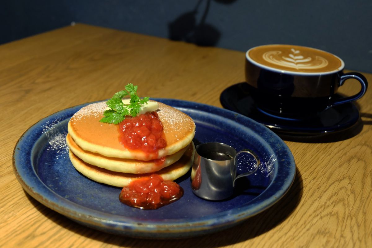「パンケーキ」(800円+税)は、粉や卵、油なども全て地元のものを使用しています。素材の良さが感じられるシンプルな味わいで幅広い世代に好評です。アートもかわいいカフェラテ(500円+税)と一緒にどうぞ。