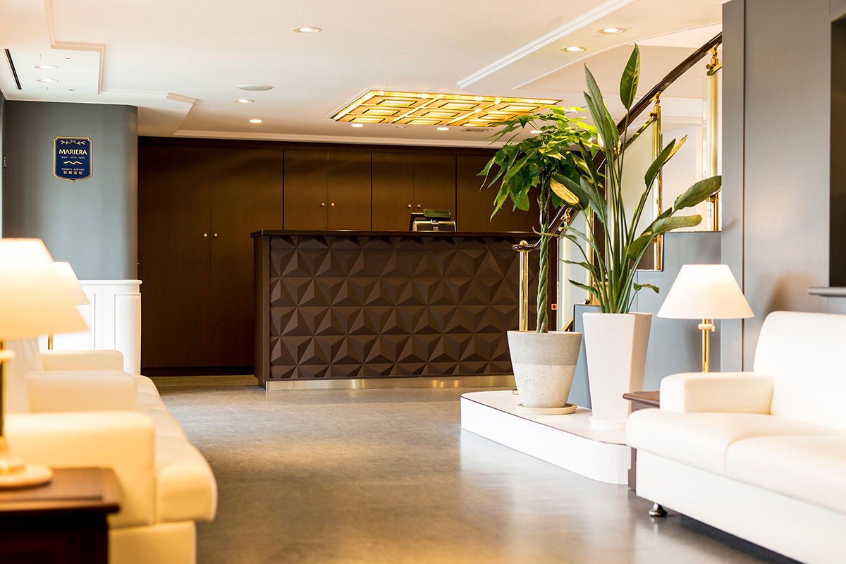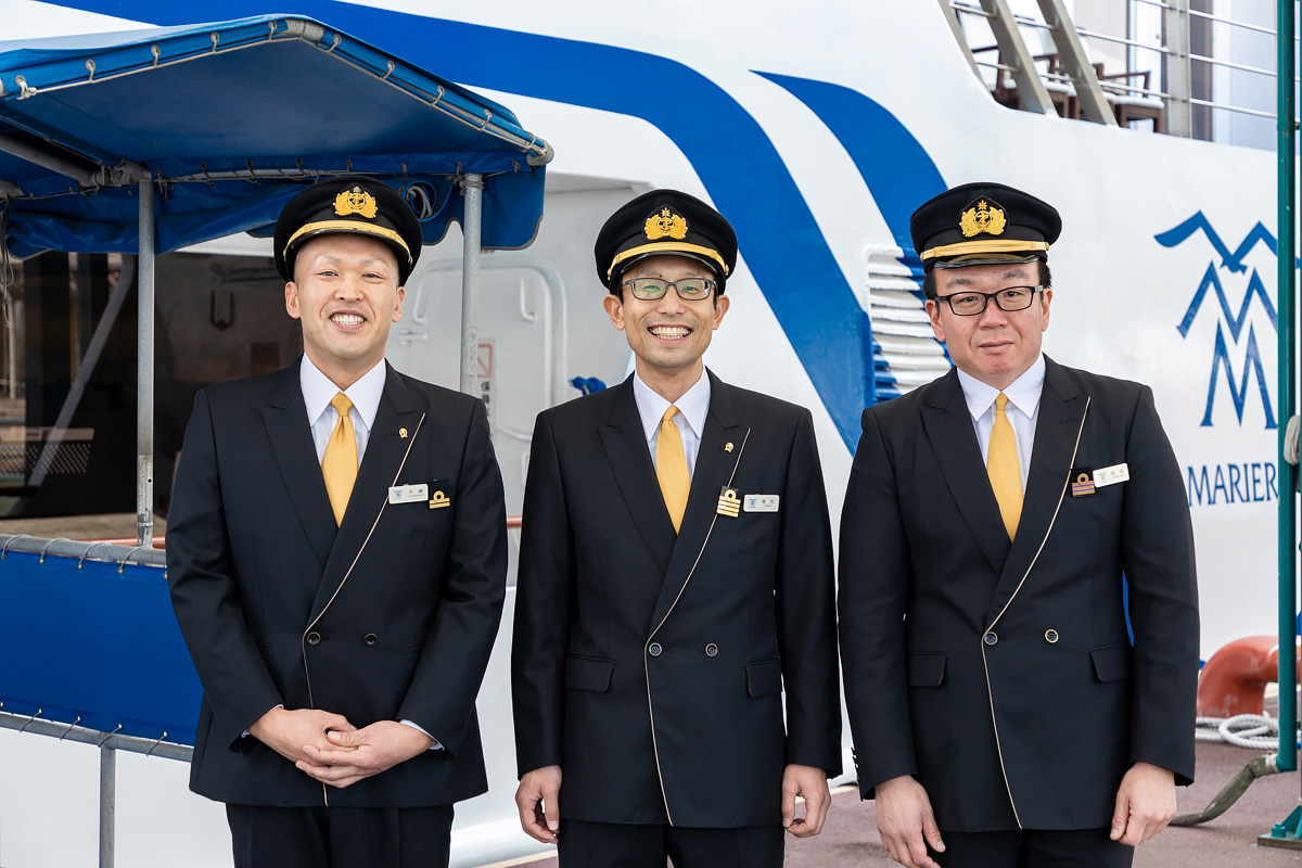乗船口では船長さんはじめクルーの皆さんがお出迎え。ステキな笑顔と凛々しい制服姿もクルージング気分を盛り上げてくれます。さっそくマリエラの船内へ!
