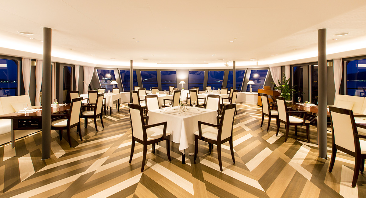 ディナークルーズでぜひ体験したいのが、シェフが腕を振るう3種類のワールドグルメコース。コース料理は船内2階のレストラン「THE VIEW」でお楽しみください。サイドの窓も開き、換気も十分です。また、特別なシートを選ぶこともできます。海を望めるプライベートデッキ付きの個室「BRISA」、そしてカップルに大人気なのがプライベートシート「RIPPLE」です。