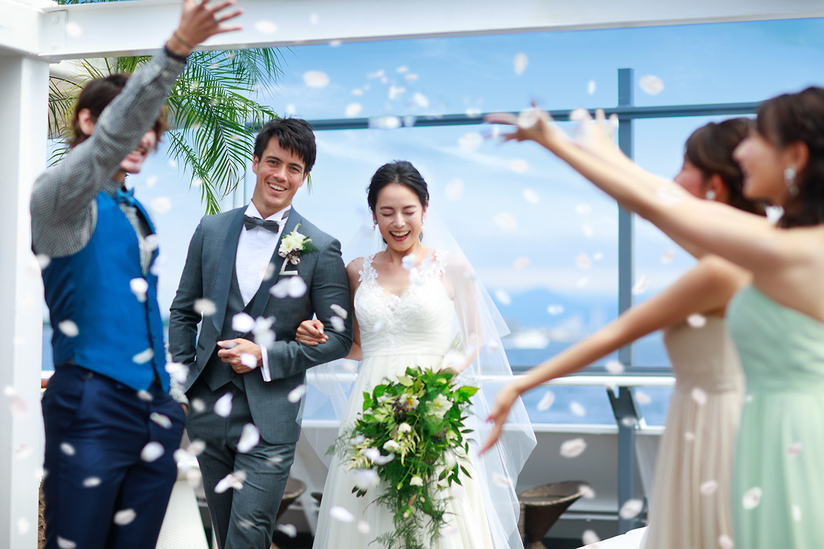 海をモチーフにした会場づくりをはじめ、展望デッキでバルーンを飛ばしたり、「青いものを身に付けてきて」とゲストにドレスコードをお願いして雰囲気づくりを楽しんだ先輩カップルも。出港時間は昼と夜からセレクト。ランチウェディングは自然光が降り注ぐ明るい雰囲気の中、青い空と海が360度ふたりを祝福してくれます。
