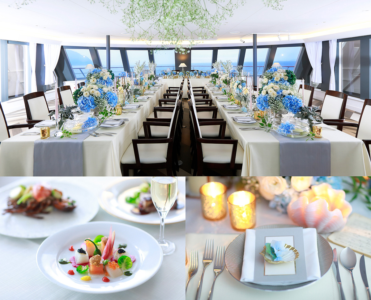 船上ウェディングはバツグンの開放感と自由度の高さが魅力!テーブルはゲストにあわせ、ゆったりとアレンジしたレイアウトも可能。おもてなしのお料理も最高の景色とともに堪能できます。