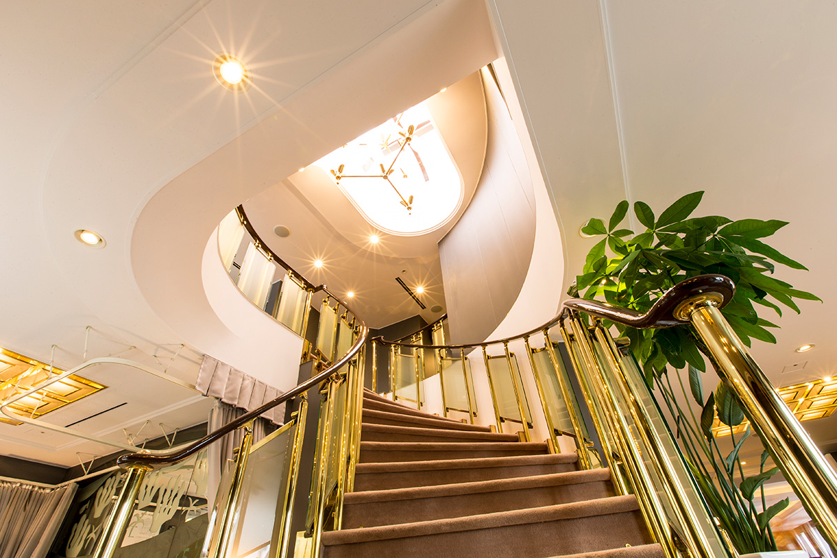 まず目に飛び込んできたのが、ゴージャスな螺旋階段。さすがリゾートシップという、一流ホテルのような優雅な内装に期待が高まります。