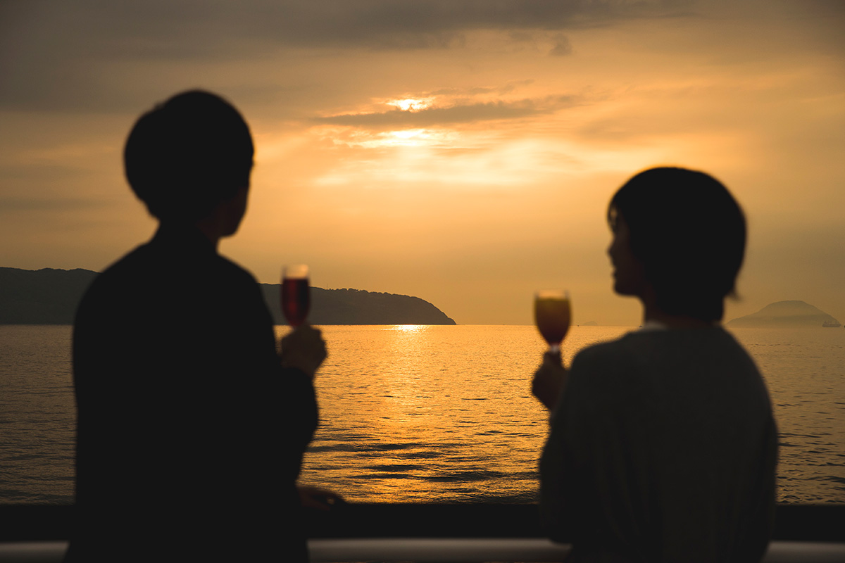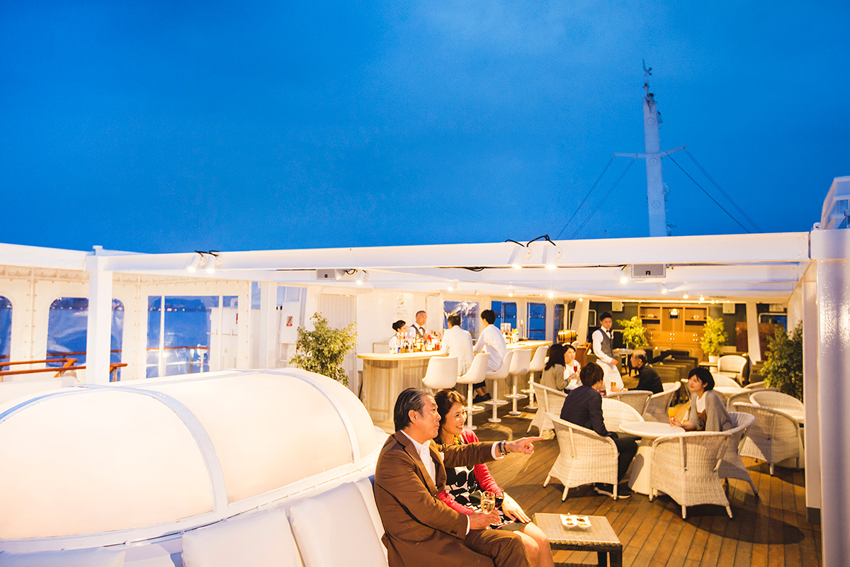夕暮れ時に出港して、幻想的なトワイライトを経て、美しくきらめく夜景に。移ろいゆく景色をゆーったりと眺めながら、会社仲間や友達と楽しく贅沢なひとときを。