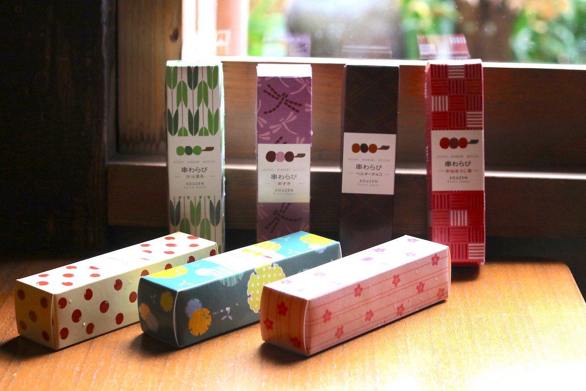 「宗禅」で人気の「串わらび」とは、ひと口サイズのわらび餅3つを串に刺したもの。ひと串ずつかわいらしいパッケージに入っています。味は、あずき、ベルギーチョコ、きな粉、さくら、和束抹茶、京都水尾柚子、和束ほうじ茶の全7種類。