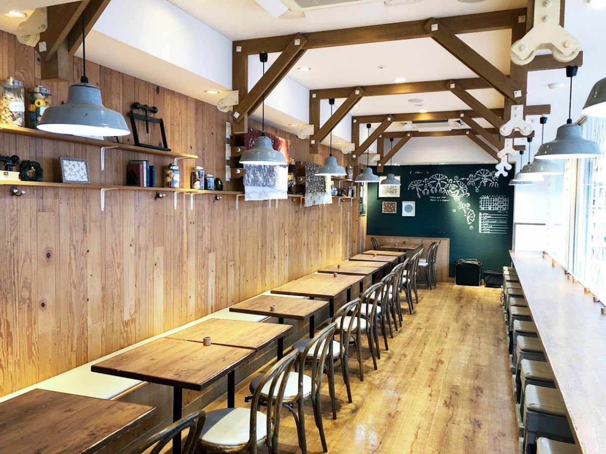 カフェスペースはレンガを基調とした落ち着いた雰囲気で、昼下がりにゆっくりコーヒーや紅茶をたしなむのにぴったりな空間です。友達とでも一人でも、気兼ねなく過ごせそう!