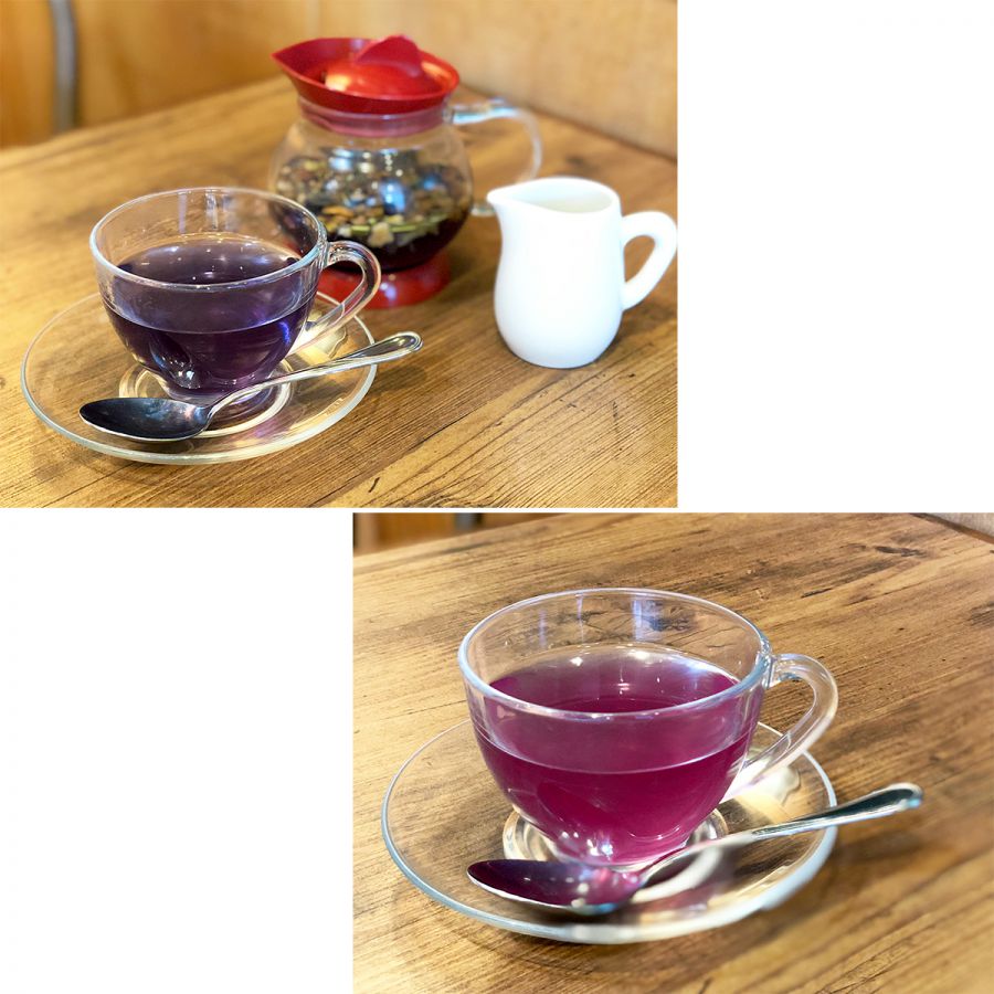 写真上のストレートの状態では深い紫色で、柑橘系の香りとレモングラスが効いたさっぱりとした味わい。そこに瀬戸内のレモンシロップを加えると、写真下のように色がピンクに、味はレモネードに変化して2度楽しめちゃいます!