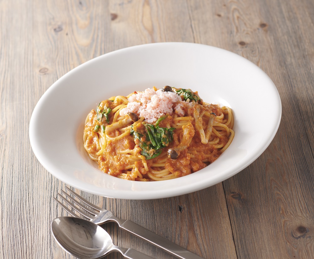 フードメニューでは、「かにとトマトクリームのパスタ」780円(税抜)がエリア限定メニューとして登場。うまみ豊かな蟹のトマトクリームソースに鳥取県境港産の蟹のほぐし身がのった贅沢な蟹パスタです。
