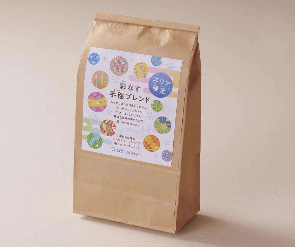 エリア限定「彩なす手毬ブレンド(あやなすてまりブレンド)200g」1200円(税抜)を持ち帰ってお家で飲むもよし。ビターチョコ、カラメル、アプリコットのような複雑な風味が感じられ、華やかで口あたりの良いコーヒーです。商品名の「彩なす」という言葉にもこだわりが。美しい文様や、四季の移り変わりの美しさという意味があり、タリーズでは珍しい和名のビーンズです。