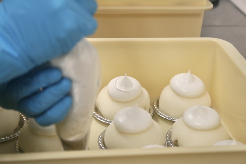 その後、くるっと丸めた大福に、中に包んだものよりも少し柔らかく仕上げたというホイップを絞ります。これだけでもすでにおいしそう…!