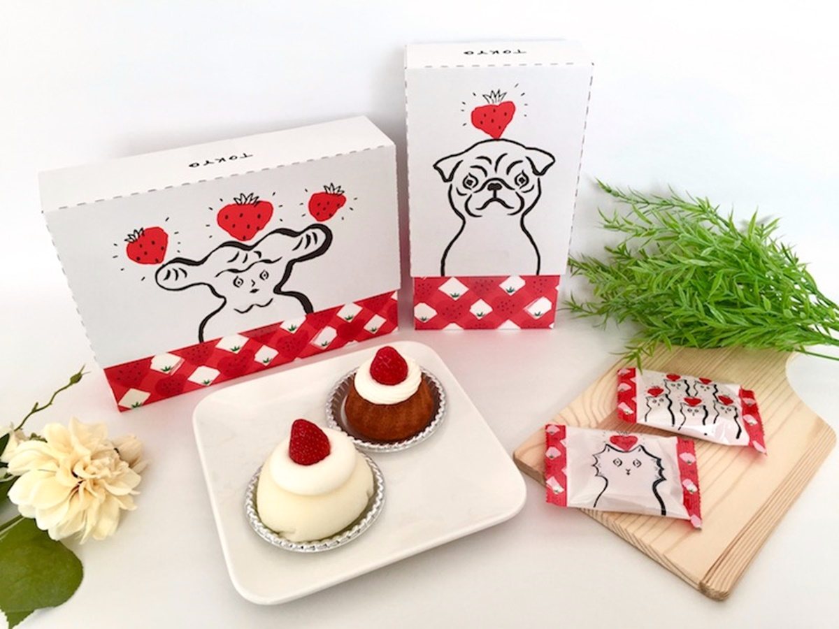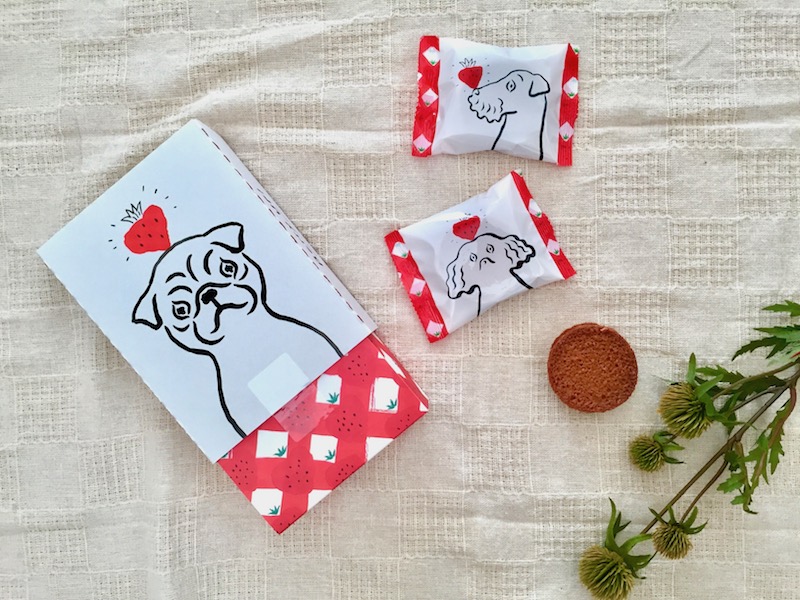 物欲しそうな瞳でこちらを見ているパグのイラストが印象的な「いちごサンドクッキー」(税込864円/5個入)は、いちごチョコをサンドした5層仕立てのクッキー。