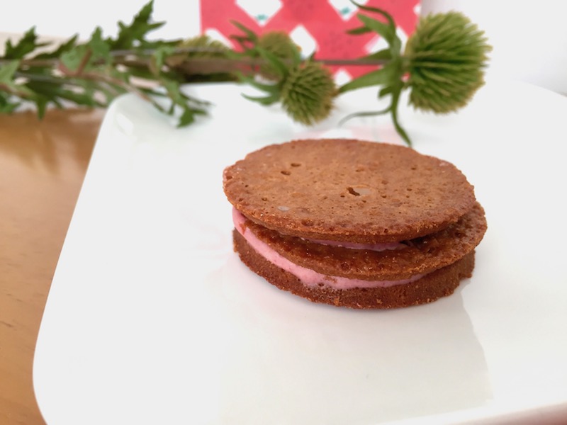 ザクザクとした固め食感のキャラメルクッキーに、甘酸っぱく、とっても濃厚ないちごチョコが挟まれています。