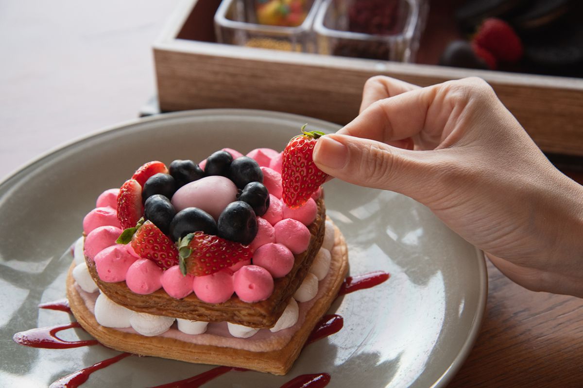 トッピングはイチゴ、ブルーベリー、ハート型のチョコレート、ココアビスケット、ラズベリーフレーク、カラーフレーク、カカオニブ、アラザンの全8種類。トッピングの種類が豊富なので、デザインは無限。大切な人と一緒に作るオリジナルパイは、きっと美味しさもひとしおのはず。