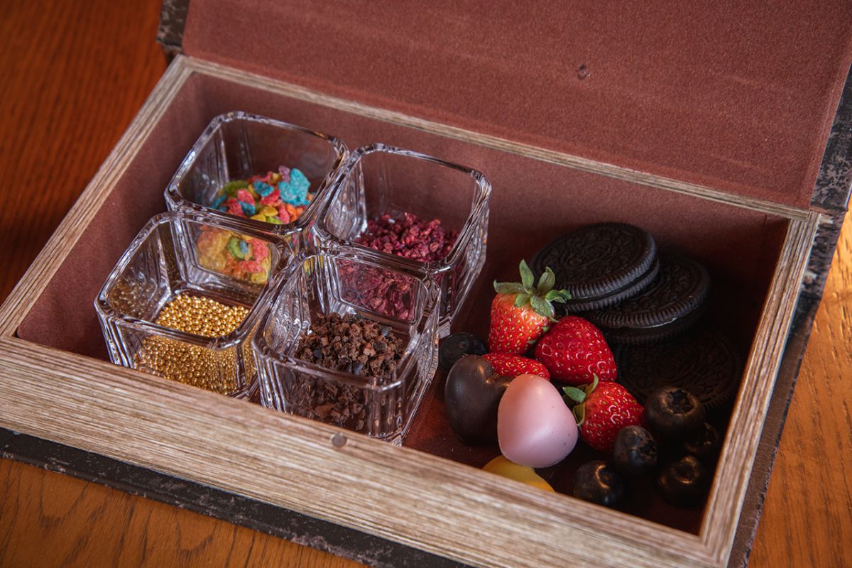 「バレンタインスモアパイ」1000円(税抜)を注文すると、ハート型のパイにピンクチョコレートとスモアをサンドし、ストロベリークリームをのせたスイーツパイと、トッピングが入ったボックスが渡されます。どんなデザインにしようかな…とわくわく。