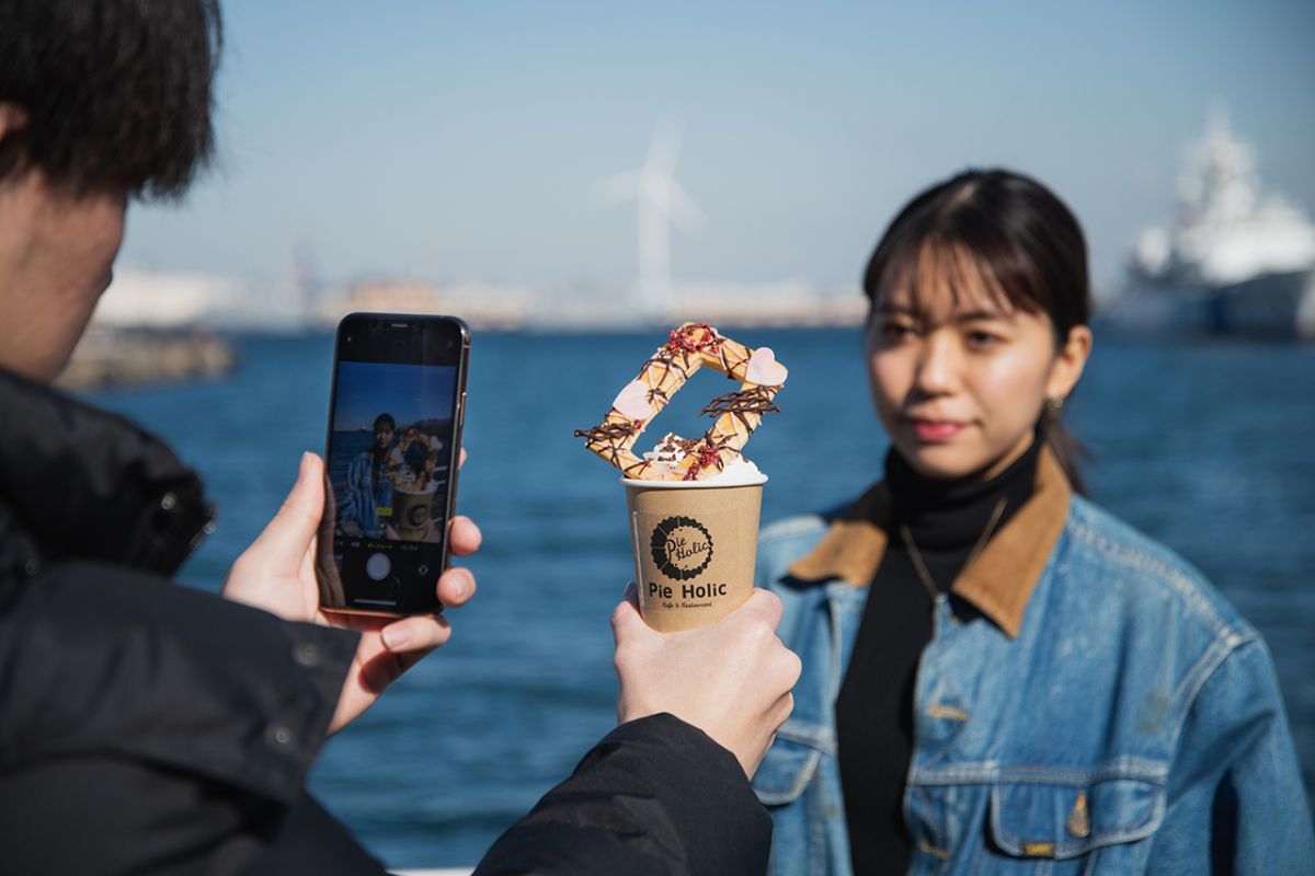 テイクアウトのときは、青空をバックに写真を撮るのがおすすめ。撮影後は、サクサクのパイフレームをそのままでも、チョコドリンクに浸しても、美味しく食べられますよ。