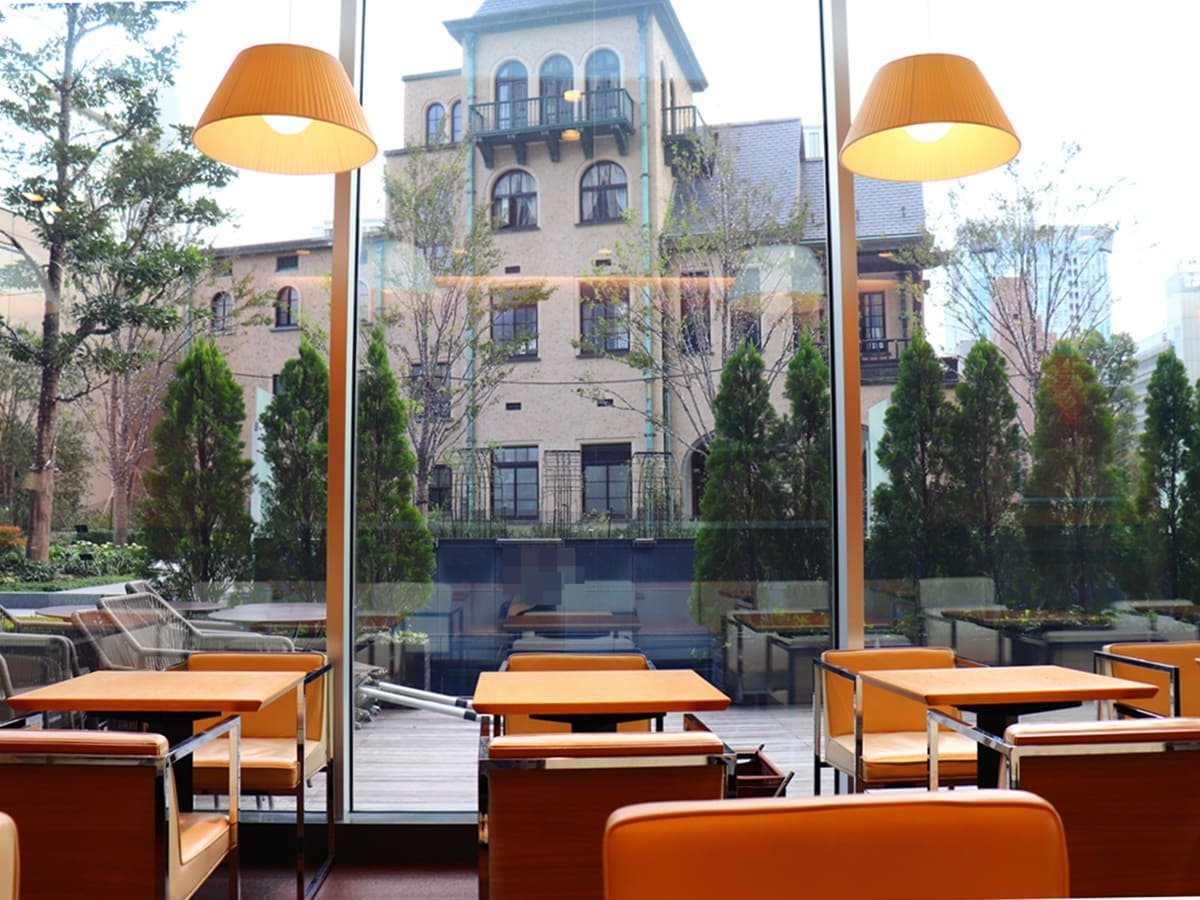 庭園側は全面ガラス張りになっていて、窓からは「赤坂プリンス クラシックハウス」のモダンな洋館が見えます。