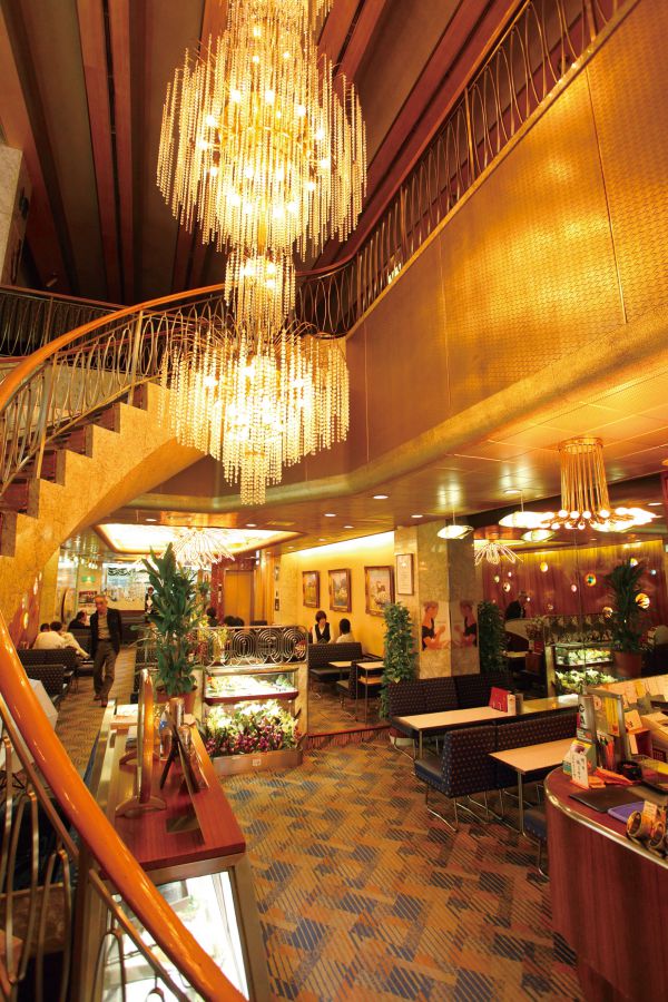 螺旋階段やオブジェ、照明器具など、初代がこだわった豪華な内装が特徴的な「純喫茶アメリカン」は1946年創業。メニューは、7種の豆をブレンドした自慢のコーヒーからスイーツ、軽食まで100種類以上と豊富です。