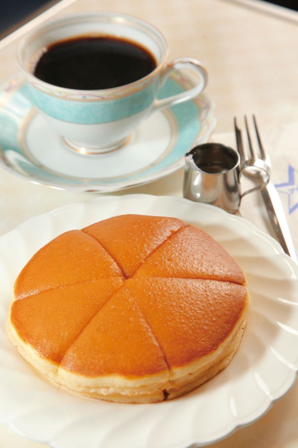 ぜひ食べたいのがホットケーキセット980円。特注の銅板で焼くホットケーキはバターを塗りカットしてサーブ。ふんわりと柔らかく、深煎りのコーヒーとの相性が抜群なんです。