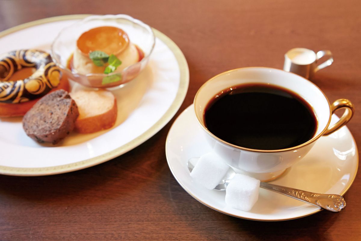 ブレンド珈琲560円と、丸福レトロスイーツプレート680円(セットで1100円)。コク深く味わいスッキリのコーヒーは、角砂糖2個を添えた長年変わらないスタイルです。