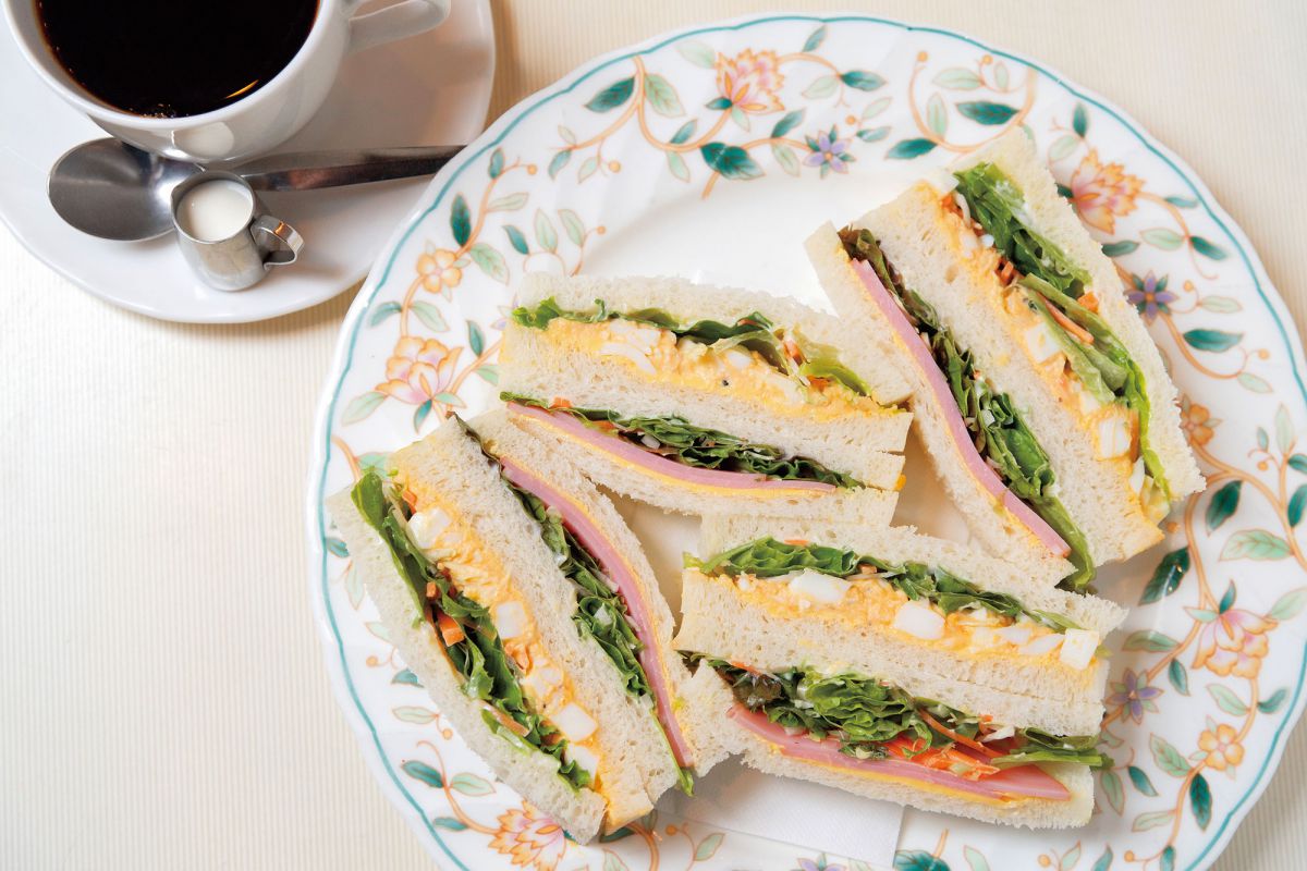 オリジナルの自家焙煎コーヒー250円と、玉子とハム、野菜のシンプルなミックスサンド500円。純喫茶らしいお手軽ランチを楽しめます。