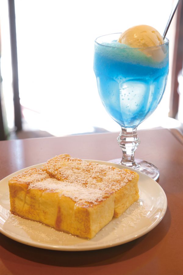 フレンチトースト(シュガー)650円は、玉子と牛乳が染みたシンプルな味わい。さわやかなブルーのクリームソーダ710円は隠れ人気メニューです。