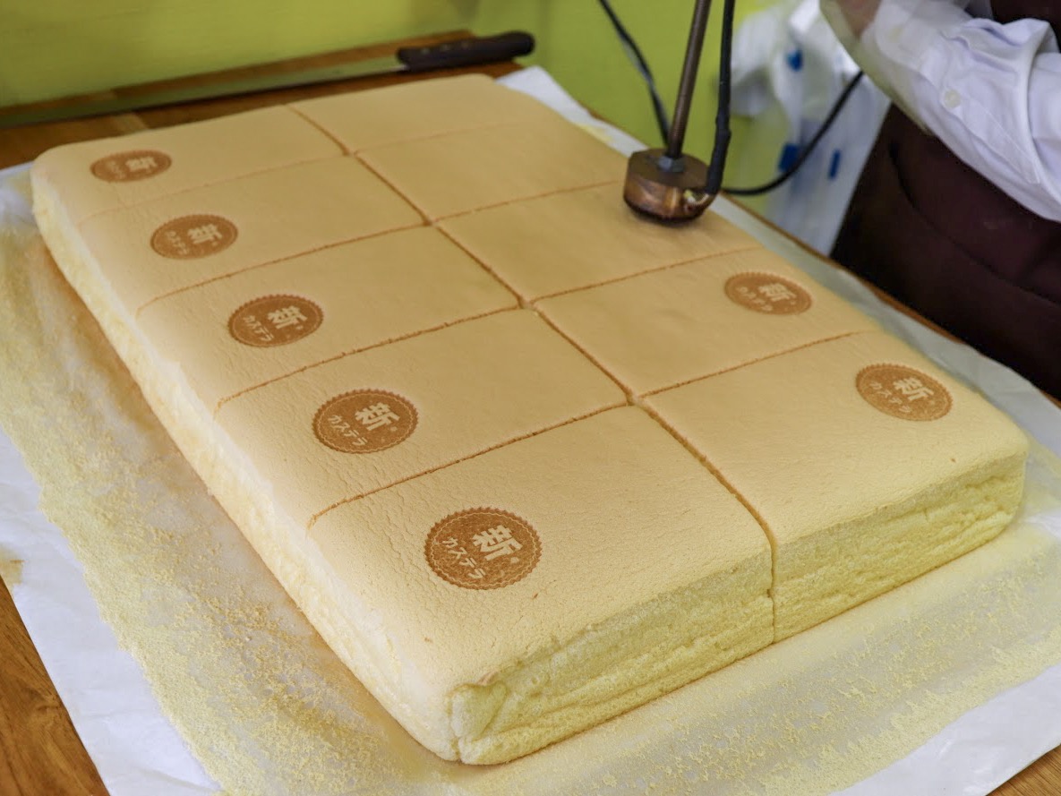 運よく焼き上がりのタイミングに出くわせば、こんなに大きなカステラが目の前に!まるでマットレスのようにふっかふか!