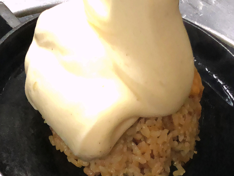 このふわっふわの卵は注文が入ってからハンドミキサーで作られるため、少し動かせばプルプルと震えるほどやわらか。卵の下には、チェダーチーズとチキンピラフが隠れています。