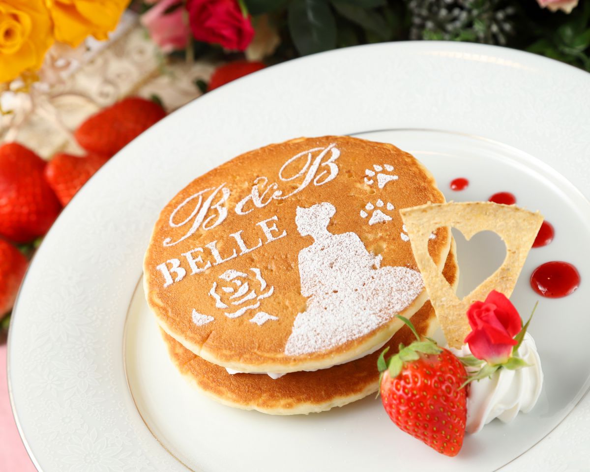 ベルのシルエットが描かれたもちふわな「苺のパンケーキ」1100円の中には、たっぷりのクリームといちご。バニラアイスと一緒に味わって。