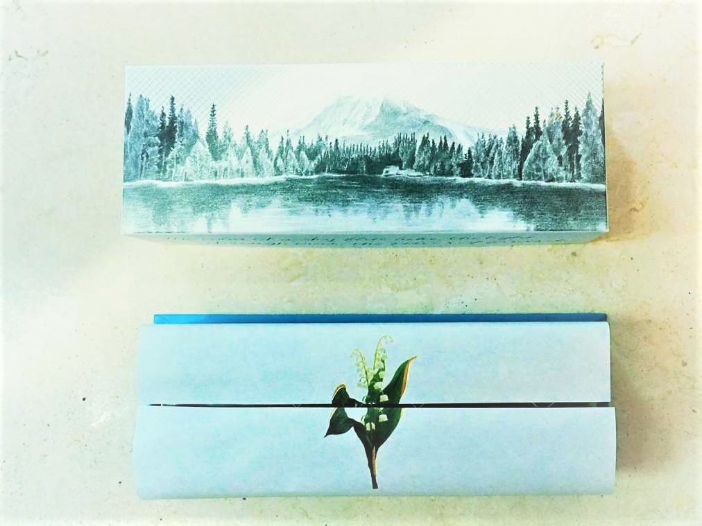 山の麓に広がる湖が描かれたロマンチックな箱を開くと、そこには繊細なスズランの花が1輪。まるで絵本のページをめくっているかのような気持ちになります。
