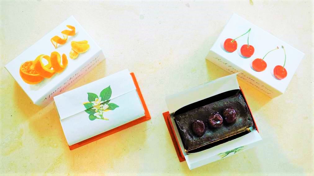 包みの紙にはそれぞれ、オレンジとさくらんぼの花が描かれているのもポイント。