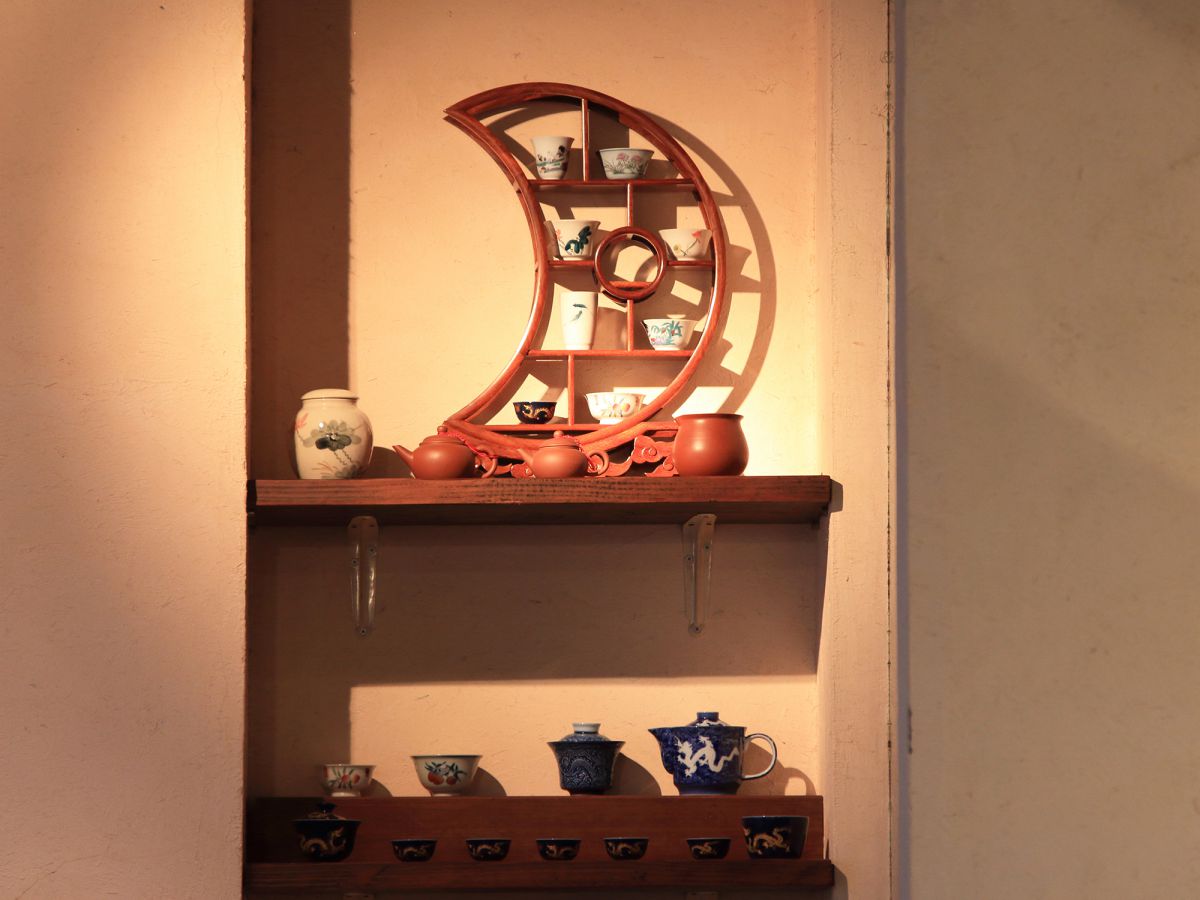 三日月型の棚や中国茶器が展示されるのも、本場の台湾茶藝館と同じ。