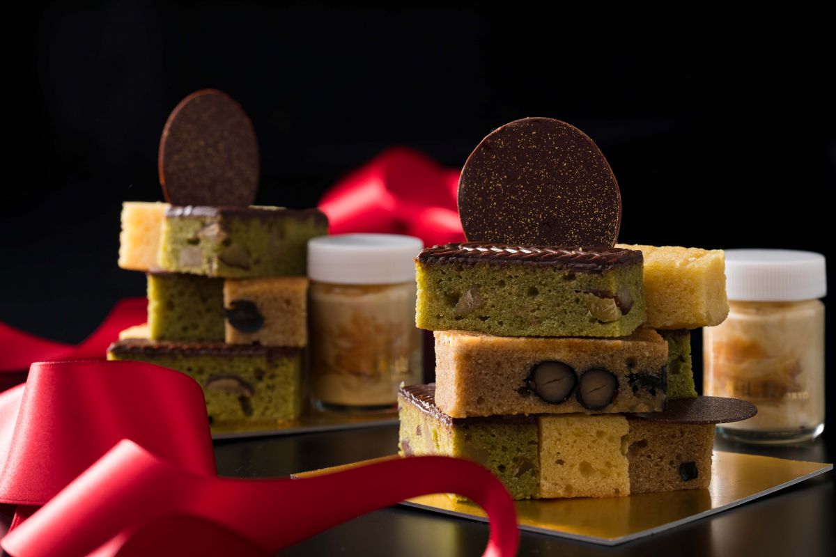 『ホテル椿山荘東京』の2020年バレンタインは、彩りが違う和素材を使った3種類の棒状スフレケーキ2800円に注目。味は「抹茶のスフレケーキ」、「和三盆スフレケーキ」、「ほうじ茶スフレケーキ」の3種類。
