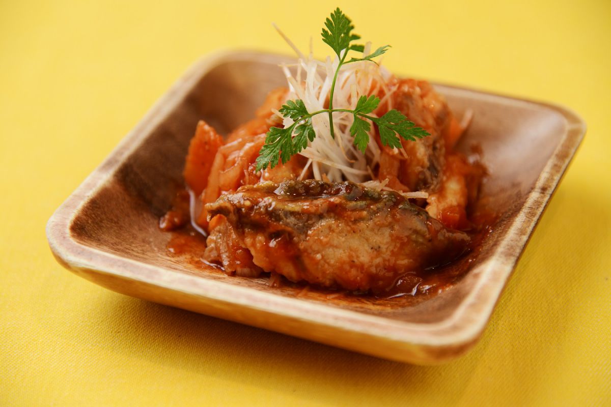 延岡市は九州山地を背に清流五ヶ瀬川が流れ、日向灘に面したエリアです。大地の恵みが豊富な漁場を作り、獲れたての魚介類がおいしいんです!「ひむか本サバ」は抗生物質などの薬を使用せずに飼育し、出荷前は7日間以上エサ止めを行って胃内容物を完全に除去しているため、脂がのり、身が引き締まって絶品!エスカベッシュ830円はトマトの南蛮漬けでほどよい酸味が特徴。