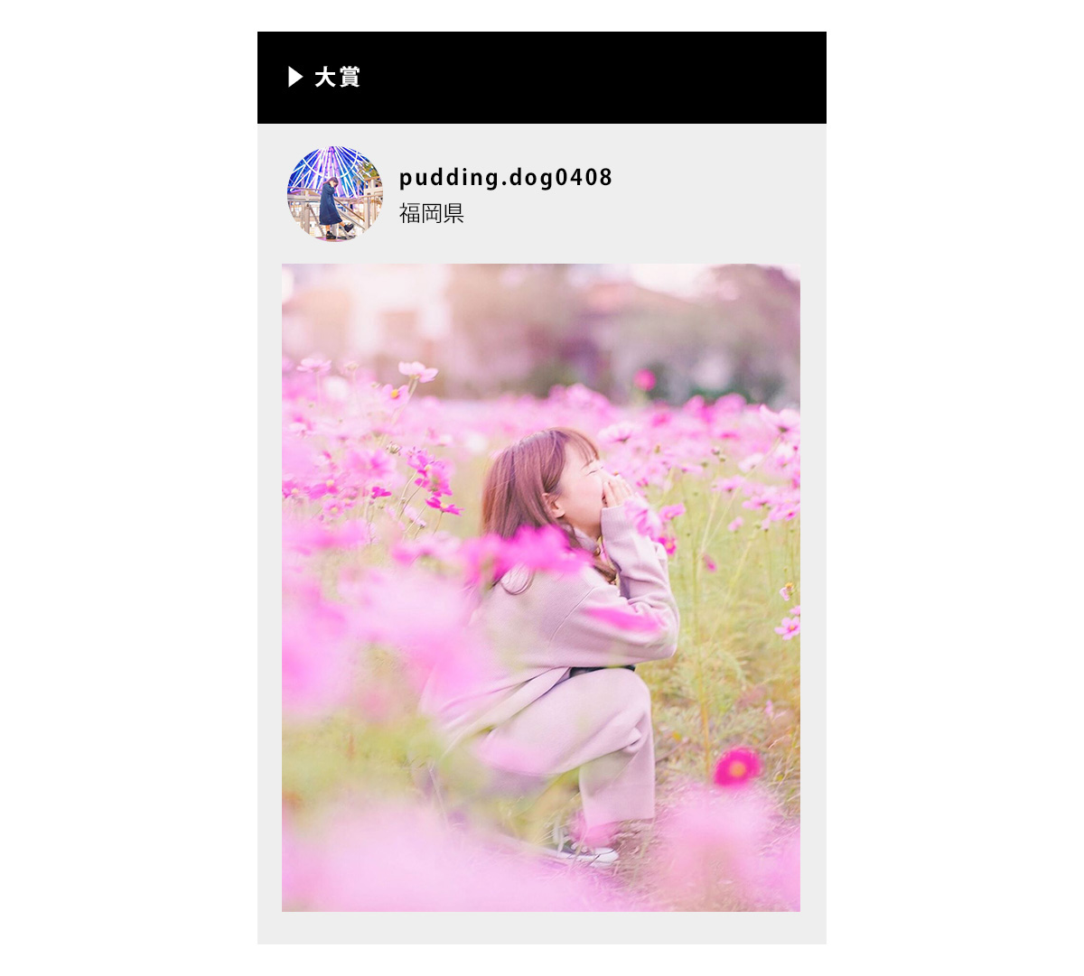 大賞は、@pudding.dog0408さんが撮影した作品!福岡のコスモス畑で撮影した一枚です。「微笑み」というキャプション通り、秋のペールカラーなコスモスに囲まれて、くしゃっとした笑顔を見せてくれています。口元を照れながら隠すのも、女の子らしい仕草ですよね。手前にあるコスモスのピントがぼ~っとぼやけているところもポイントです!