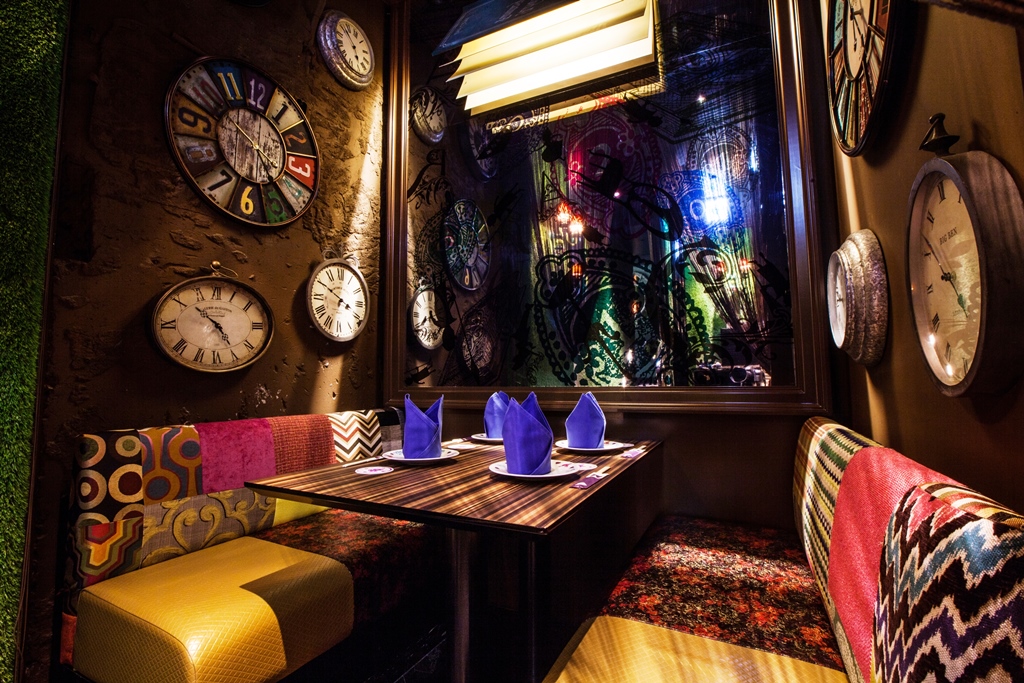 ハチャメチャな時を刻む時計たちに囲まれるボックス席。“時間を忘れて”非日常感を味わいたい、そんな気分にぴったり。部屋ごとの個性があって、まるでテーマパークさながらです。