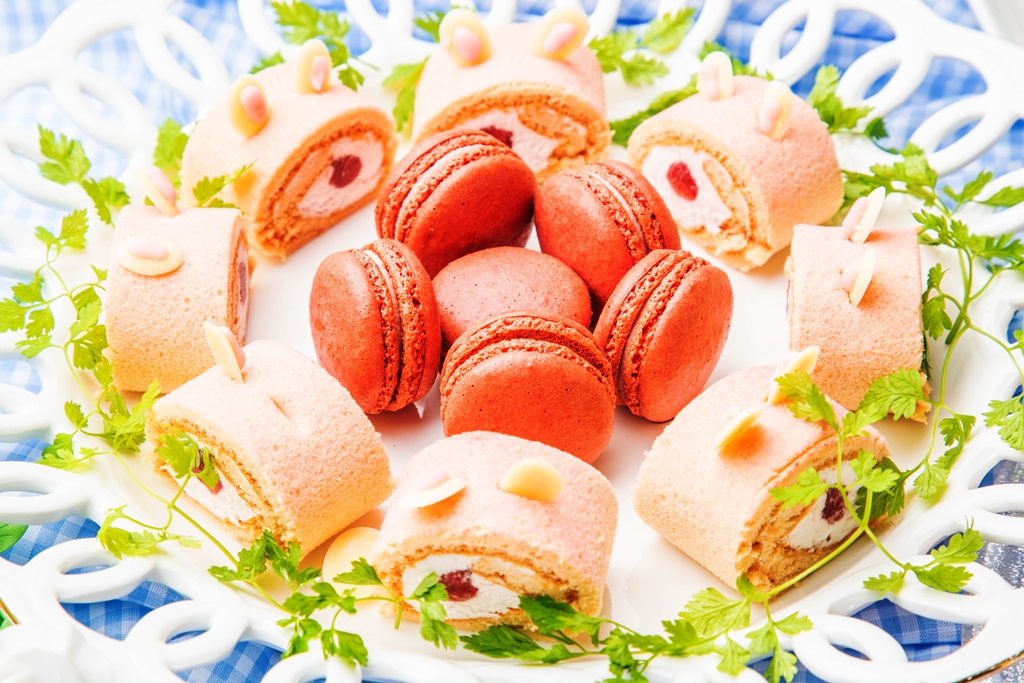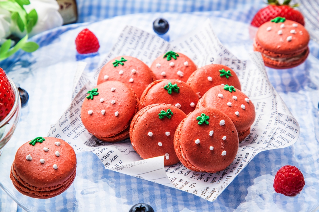 ひとつひとつに種やヘタが描かれたかわいすぎるマカロンも、もちろんいちご味。