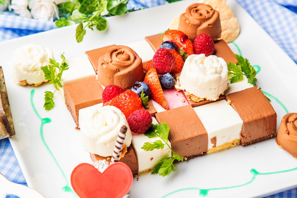 「不思議の国のアリス」の続編、「鏡の国のアリス」で描かれたチェス盤を、レアチーズケーキで再現した一皿も。ビュッフェ台には、約30種類のスイーツと15種類以上の料理が並び、充実の内容です。