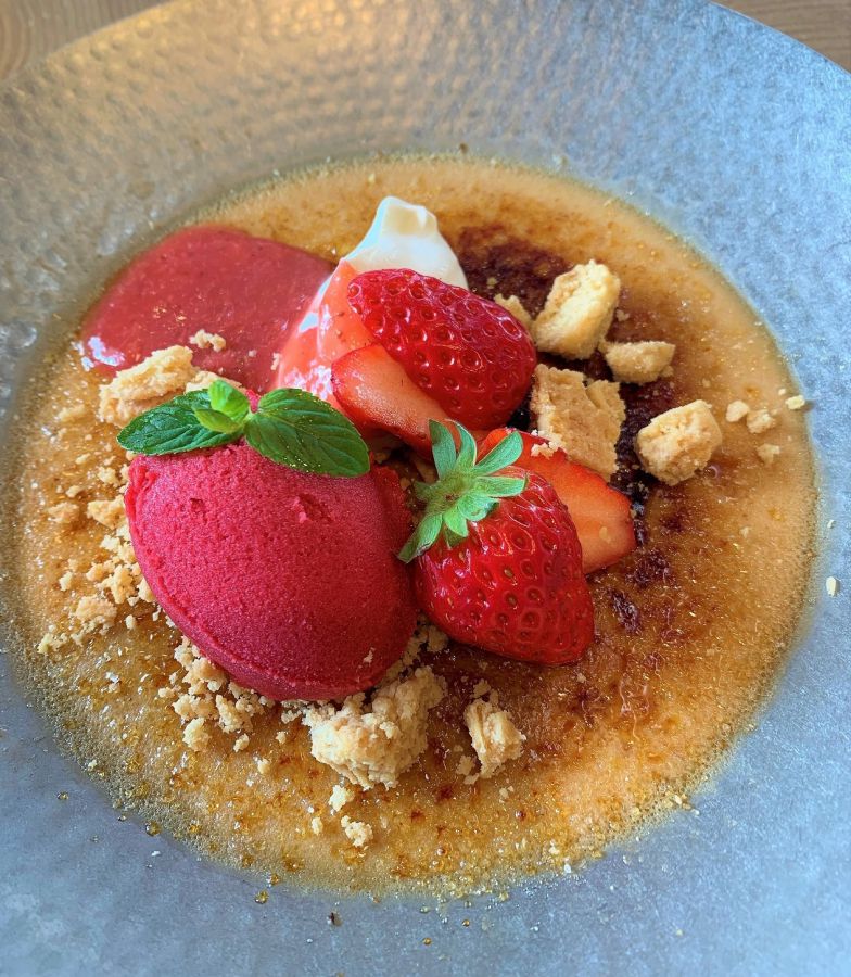 1日15食限定『QUAYS pacific grill』(1・2階)の「紅ほっぺのクレームブリュレ」850円は、いちごの入ったクレームブリュレに、いちごのソルベとフレッシュいちごをトッピングしたデザート。