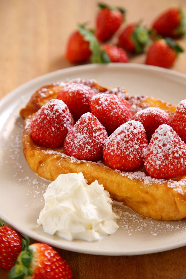 ふわとろフレンチトーストに「とちおとめ」を贅沢にトッピングした『ELOISE's cafe』(2階)の「とちおとめフレンチトースト」1980円は1日20食限定。相性抜群のホワイトソースと一緒にどうぞ。