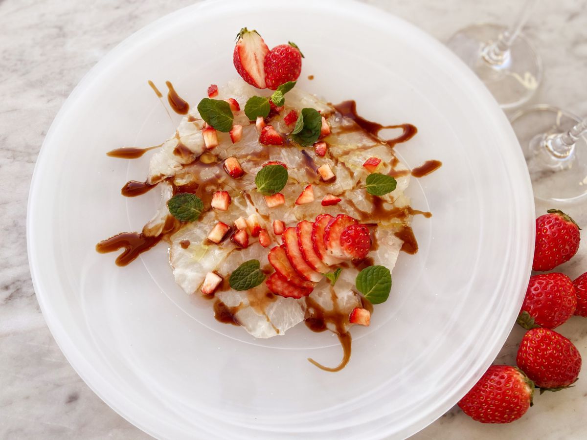 『COLONIAL BEACH』(2階)は、「鮮魚マリネのカルパッチョ イチゴとミントのヴィネグレットソース」1850円。いちごの甘酸っぱさとミントの爽やかな香りで、新鮮な魚が味わえる新感覚の一皿です。