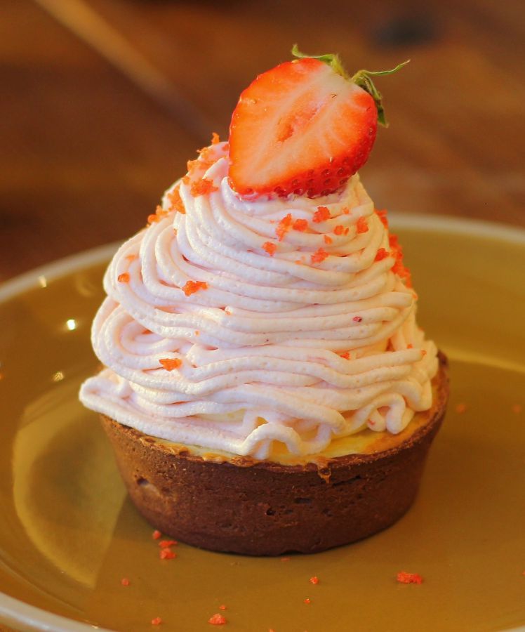 『The CAFÉ by good spoon』(2階)は、チーズたっぷりのタルトにまるまるいちごが 入った「いちごづくしのモンブラン」680円。見た目もカワイイ人気商品です。