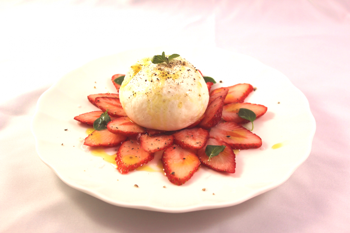 『ハングリータイガー』(2階)の幻のチーズを使った「イチゴとブラータチーズのデザートサラダ」1280円。ブラータの生クリームのような味わいと、甘酸っぱいイチゴのハーモニーが楽しめる一品です。
