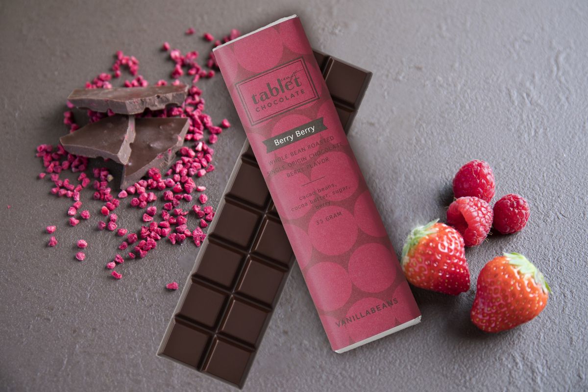 『VANILLABEANS THE ROASTERY』(2階)の「タブレットショコラ・ベリーベリー」1枚540円。カカオ豆の焙煎からこだわったクラフトチョコレートに、果実感のあるドライベリーがたっぷりです。